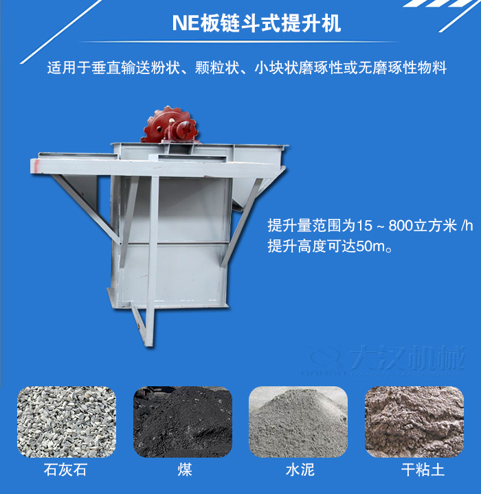 NE板鏈斗式提升機(jī)為板鏈?zhǔn)健⒅亓φT導(dǎo)卸料的提升設(shè)備,該系列提升機(jī)具有NE15 ~ NE800多種規(guī)格。提升量范圍為15 ~ 800m³ /h,提升高度可達(dá)50m。