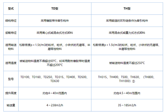 TD型斗式提升機(jī)由運(yùn)行部分(料斗與牽引膠帶),帶有傳動(dòng)滾筒的上部區(qū)段,帶有拉緊滾筒的下部區(qū)段,中間機(jī)殼,驅(qū)動(dòng)裝置,逆止制動(dòng)裝置等組成,適用于向上輸送松散密度ρ<1.5t/m3粉狀、粒狀和小塊狀的無(wú)磨琢性和半磨琢性散狀物料,如煤、砂、焦末、水泥、碎礦石等。